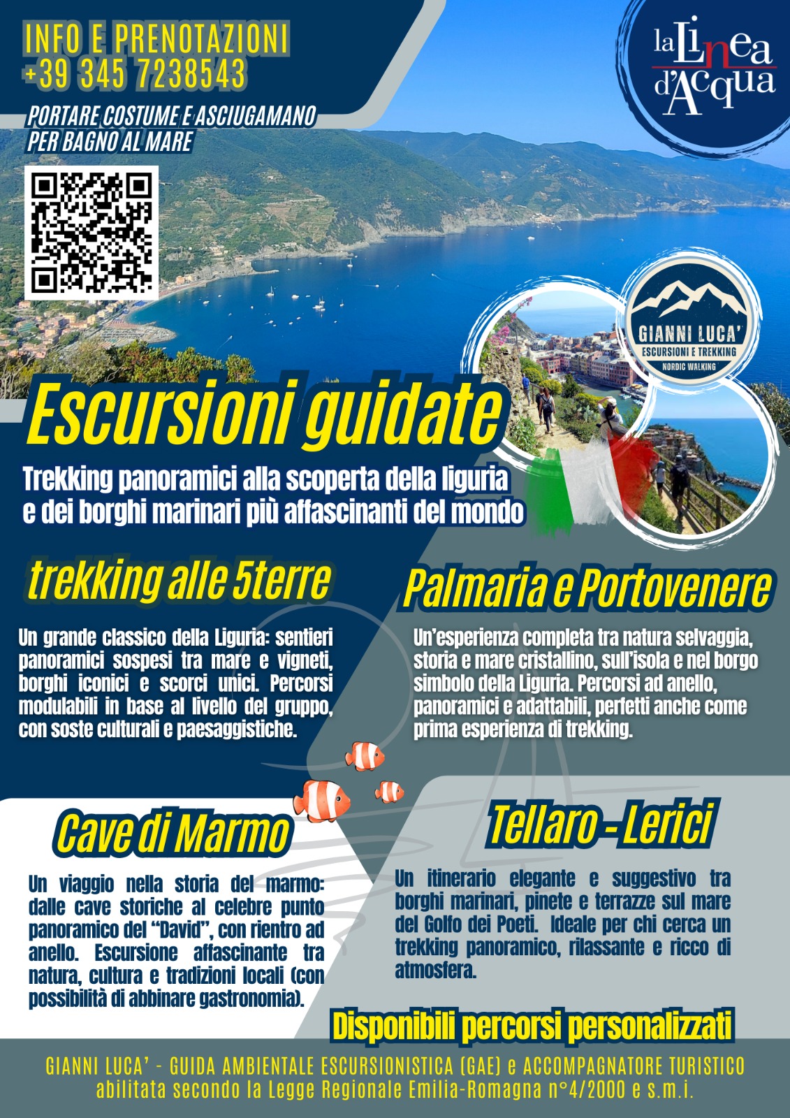 Sentieri panoramici sospesi tra mare e vigneti, con soste culturali e percorsi modulabili in base al livello del gruppo.